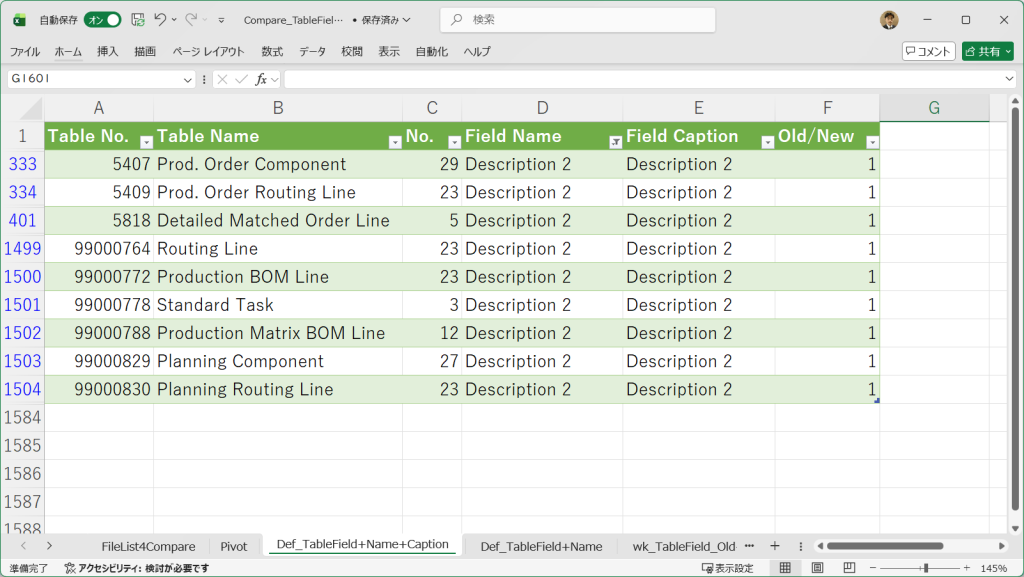参考までに、V27時点で”Description2”(説明2)を持っているテーブルの一覧の一部です。全部表示しきれていないですが、フィルタして数えたところ88個ありました。受発注伝票や棚卸伝票、在庫移動伝票、アレンブリーオーダーなど、ロジ系の伝票明細で多くもている印象です。今回追加されたのは生産管理系の明細テーブルなので、これまでの流れを汲んで拡張したことがわかります。