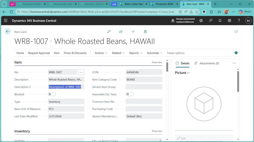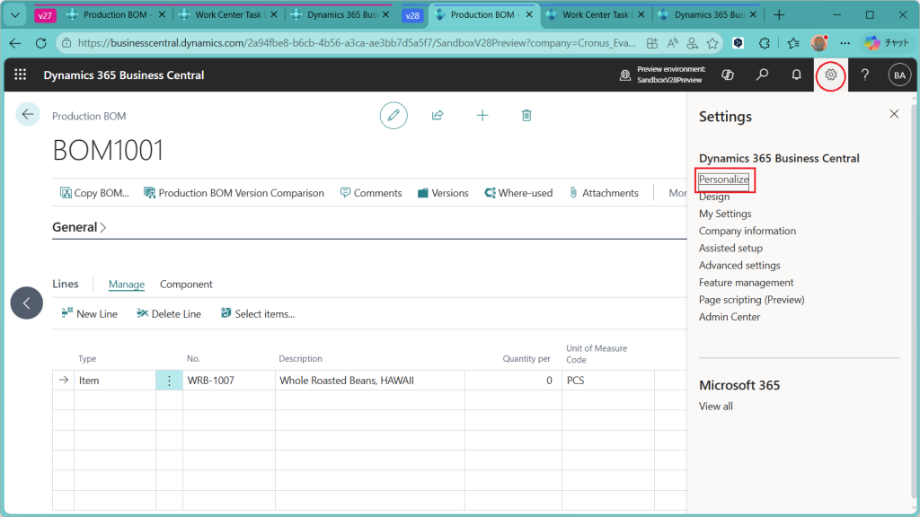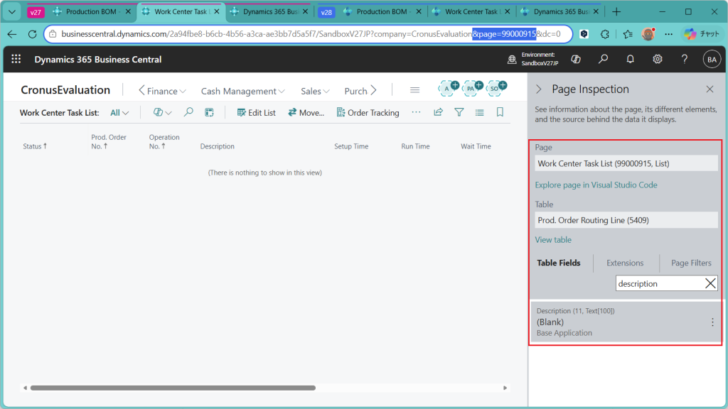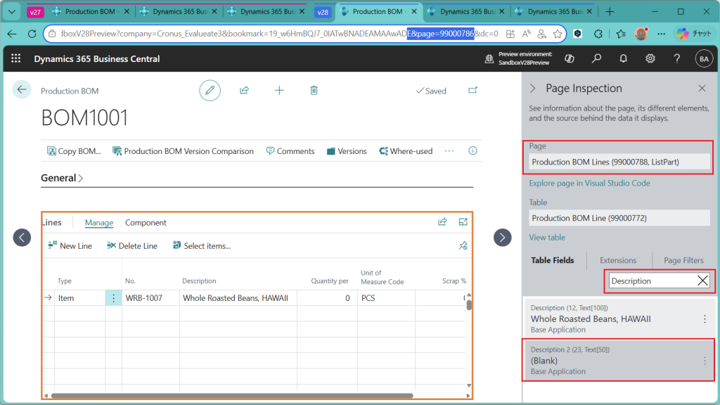 V27の同じページを見てみます。”Description”はありますが、”Description2”は存在しません。V28で項目追加された、ということです。そしてページ検査モードで見ると、このページ(正確にはフォーカスしているラインタブのサブフォームページ)のソースとなるテーブルを確認できます。”9900772:Production BOM Line”テーブルで、これは冒頭に載せた”V28でDescriptionが追加されたテーブル”のExcelに含まれているテーブルです。