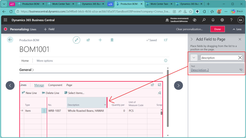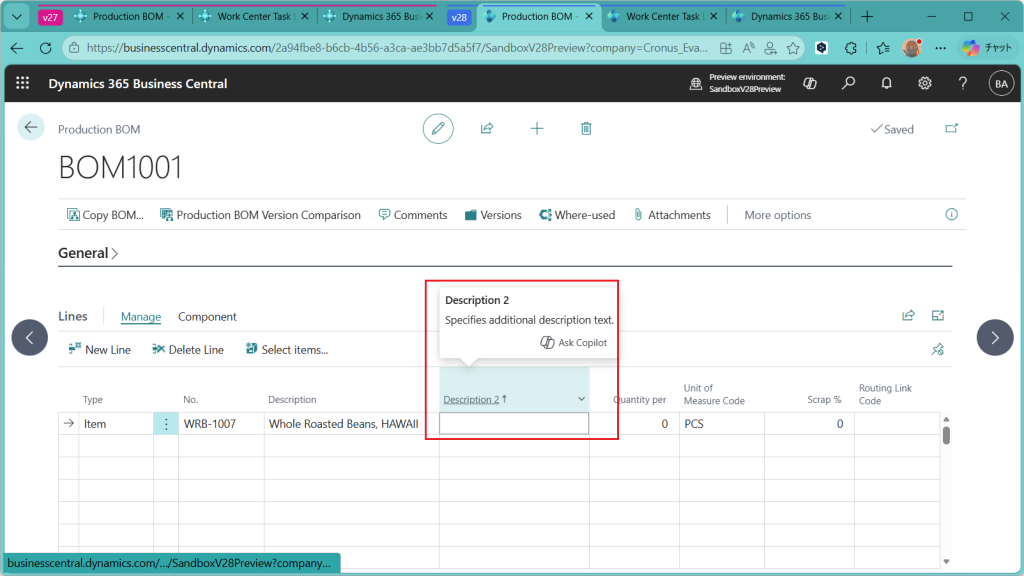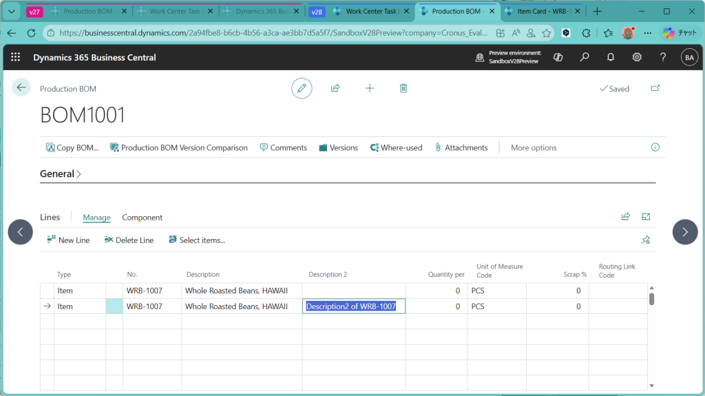 Production BOMのラインに品目を指定すると、品目マスタのDescription2が読み込まれます。