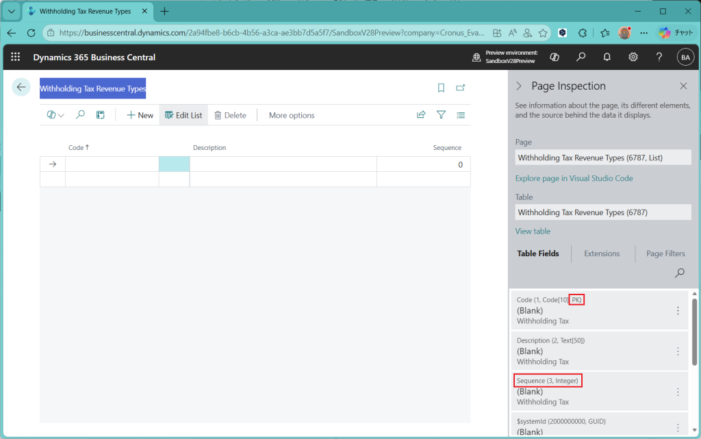 まずはWithholding Tax Bus. Post. Groupから。CodeとDescription(説明テキスト)の2項目のみで、Codeがキーになっていることがわかります。ページ検査機能で見る限り、隠れている項目もなく(3項目目にSystemidが来ていて、これは隠されてて良い)、シンプルな構造だとわかります。