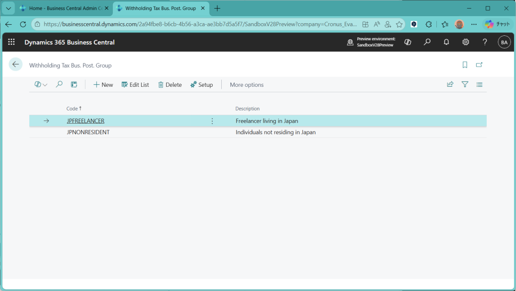 まずはWithholding Tax Bus. Post. Groupから。一般にBus.系のPosting Groupはベンダーに紐づけることが多いことから類推して、フリーランス用のコードと海外居住者用のコードを作っておきます。
